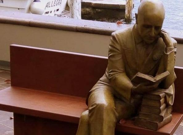 E’ stata inaugurata oggi nella centrale piazza della Borsa, a Trieste, la statua dedicata a Gabriele D’Annunzio. La scultura, realizzata dal bergamasco, Alessandro Verdi, raffigura il poeta pescarese a gambe accavallate seduto su di una panchina mentre è assorto nella lettura con il gomito del braccio sinistro appoggiato su di una pila di libri.