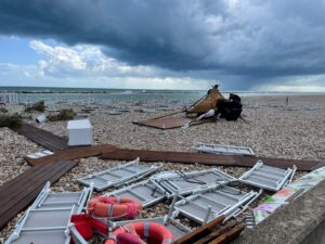 Danni ingenti sono stati rilevati anche ad alcuni stabilimenti balneari: tende da sole, dehors di attività commerciali, strutture turistiche. Le linee elettriche hanno subito i guasti con interruzioni temporanee dell’energia in alcune zone. Gran parte della segnaletica stradale è stata abbattuta dalla forza del vento. (nella foto l’arenile di Torino di Sangro).