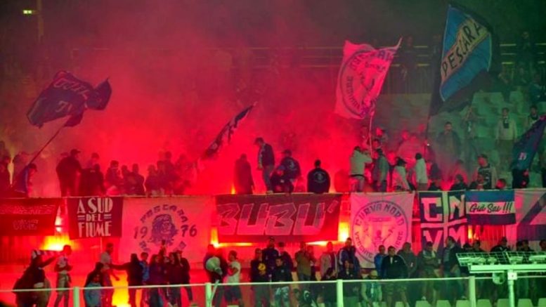 squadra marchigiana, venivano scambiati per ultras anconetani. A fronte dello sbarramento messo in atto dalle forze dell’ordine, il gruppo di sostenitori pescaresi dava vita ad un lancio di fumogeni, bottiglie e pietre che provocavano il