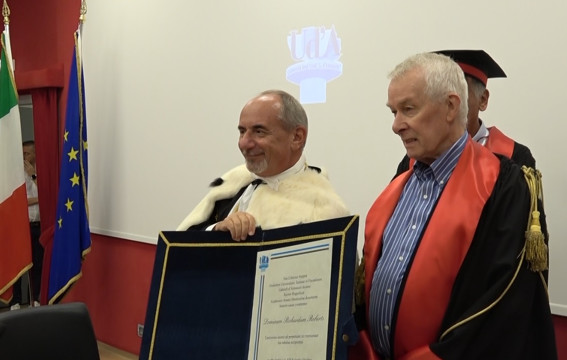 A sir Richard John Roberts, biochimico e biologo inglese, Premio Nobel per la Medicina nel 1993, è stato conferito stamani il titolo di Membro onorario del Corpo accademico dell’Università degli Studi “Gabriele d’Annunzio” di Chieti-Pescara. Il prestigioso riconoscimento è stato deciso dal Senato accademico dell’Ateneo che ha accolto all’unanimità la proposta avanzata dallo stesso Rettore, Liborio Stuppia. Sir Richard Roberts, che ottenne il premio Nobel per la medicina insieme a Phillip Allen Sharp per la scoperta dello splicing dei geni, ha tenuto la sua lectio magistralis davanti alla Comunità accademica della “d’Annunzio” dopo esser stato accolto nel Campus universitario dal Rettore, Liborio Stuppia, e dai Direttori di Dipartimento dell’area medico-scientifica.