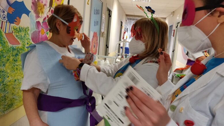 Festa di Carnevale in Pediatria con la Ricoclaun. Mascherine, abiti di carta crespa, chitarra, palloncini per divertire i piccoli pazienti