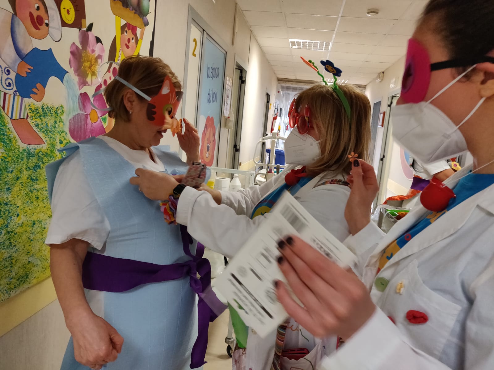 Festa di Carnevale in Pediatria con la Ricoclaun. Mascherine, abiti di carta crespa, chitarra, palloncini per divertire i piccoli pazienti