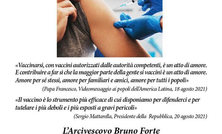In occasione delle celebrazioni in onore di San Michele Arcangelo, Patrono della città, domani alle 18 presso la chiesa di Santa Maria Maggiore monsignor Bruno Forte celebrerà l’eucaristia per tutti coloro che stanno operando al servizio della campagna vaccinale e per invitare a vaccinarsi quanti non l’hanno ancora fatto. Una solenne occasione per lanciare un messaggio di speranza e responsabilità. Per chi vorrà la messa potrà essere seguita anche grazie alla DIRETTA TARGATA RETE8.