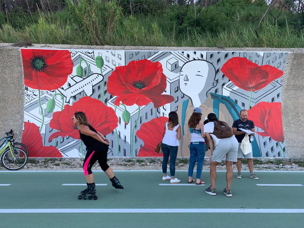 Sulla Via Verde della Costa dei trabocchi si inaugura il nuovo murale di Millo, lo street artist che ha disegnato papaveri rossi giganti sui muri della pista ciclabile