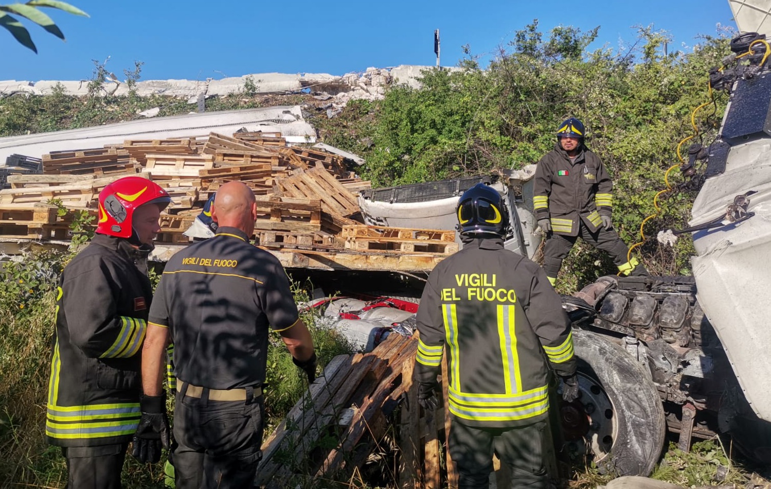 Il Tir carico di bancali in legno, in transito lungo l’autostrada, per cause ancora in corso di accertamento è uscito di strada finendo nella scarpata sottostante. Le squadre dei Vigili del Fuoco, giunte sul posto, hanno provveduto a mettere in sicurezza l’area ed estrarre il conducente dalla cabina del mezzo per poi assicurarlo ai sanitari del 118 per i primi soccorsi.
