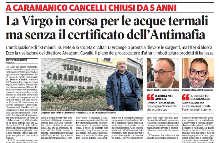 “La Virgo in corsa per le acque termali ma senza il certificato dell’Antimafia”: l’anticipazione di “31 minuti” su Rete8. La società di Altair D’Arcangelo pronta a rilevare le sorgenti, ma l’iter si blocca. La rivelazione del direttore Areacom, Cavallo. Il piano del procacciatore d’affari: imbottigliare prodotti di bellezza. Di questo e di altro si parlerà domani sera nella trasmissione curata e condotta da Pietro Lambertini ’31 minuti’. Le anticipazioni dettagliate sulle pagine de il Centro in edicola oggi.