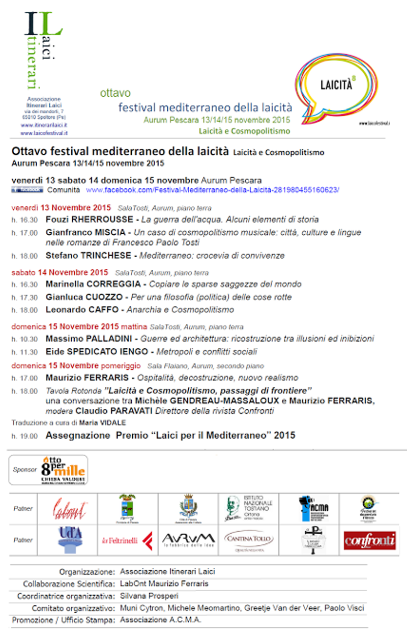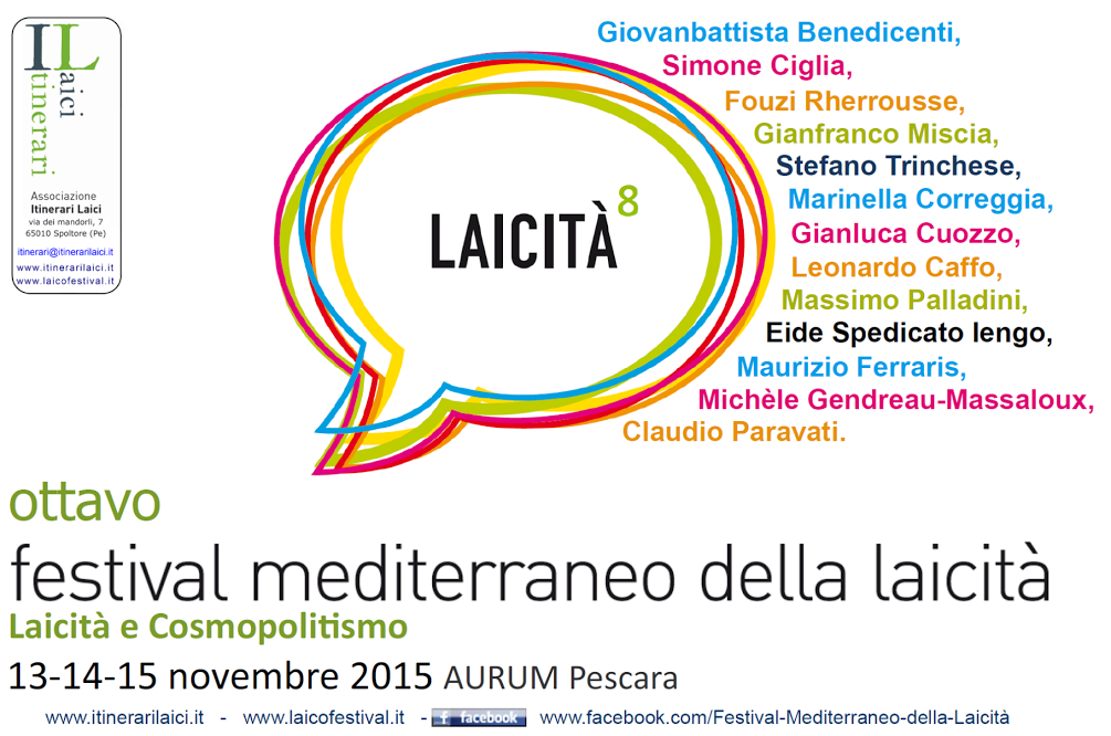 L’associazione “Itinerari Laici” organizza a pescara l’ottava edizione del Festival mediterraneo della laicità. con il sostegno dell’Otto per Mille della Tavola Valdese che lo ha selezionato tra i progetti culturali nazionali oltre che del Comune di Pescara con l’assessorato alla Cultura. La direzione Scientifica è del LabOnt Istituto diretto dal prof. Maurizio Ferraris dell’Università di Torino.