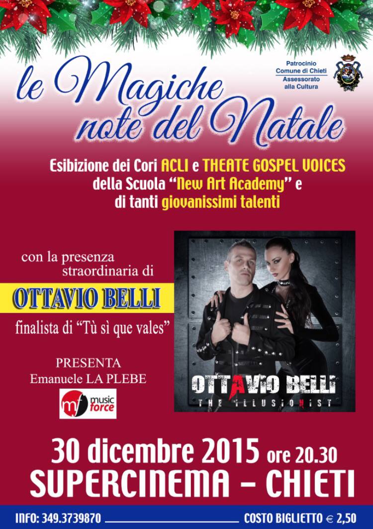 Chieti: le magiche note del Natale. Domani sera, alle ore 20.30 , il Supercinema ospiterà un evento organizzato dall’ Assessorato comunale alla Cultura in collaborazione di Music Force, che vedrà protagonisti i giovani talenti canori abruzzesi. Special guest sarà Ottavio Belli, Il mago illusionista teatino protagonista del seguitissimo show televisivo “Tu sì quevales” che è rientrato poche settimane fa da Tirana dov’é stato ospite d’onore del KengaMagjike 2015, evento musicale seguito da oltre 5 milioni di telespettatori in tutto il mondo. Belli si esibirà in tre numeri speciali. Lo spettacolo, sarà presentato da Emanuele La Plebe Cellini e vedrà esibirsi numerosi ospiti tra i quali i cori Theate Gospel Voices, Acli 2000 e la scuola New Art Academy.