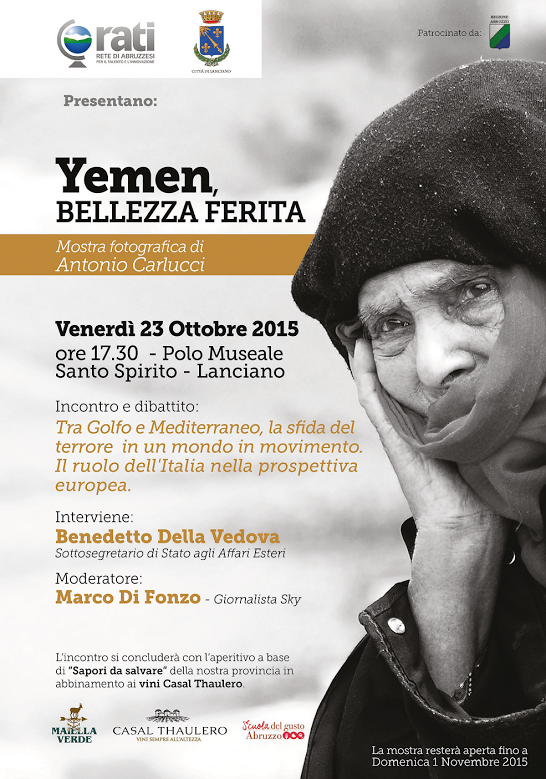 Tema del convegno: “Tra Golfo e Mediterraneo, la sfida del terrore in un mondo in movimento. Il ruolo dell’Italia nella prospettiva europea”. All’incontro-dibattito parteciperà il sottosegretario di Stato agli Esteri Benedetto Della Vedova. Il simposio si svolgerà in occasione dell’inaugurazione della mostra fotografica “Yemen, bellezza ferita”, del prof. Antonio Carlucci che resterà aperta fino a domenica 1 novembre. L’evento è organizzato da RATI, Rete di abruzzesi per il talento e l’innovazione e dal Comune di Lanciano, con il patrocinio della Regione Abruzzo.