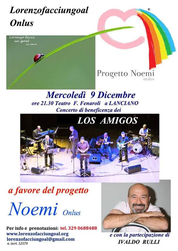 Lanciano : Musica e risate per la solidarietà al teatro Fenaroli il 9 dicembre prossimo alle ore 21,30 La Onlus Lorenzofacciungoal ha organizzato il concerto che vedrà protagonisto lo storico gruppo musicale abruzzese dei Los Amigos. Due ore di musica spaziando tra cover degli anni 60 fino ad oggi. Il cabarettista Ivaldo Rulli allieterà ulteriormente la serata con la sua comicità e il suo sarcasmo. La causa della Onlus Lorenzofacciungoal per questa occasione sarà la solidarietà. Al Teatro sarà possibile effettuare donazioni libere, e il ricavato della serata sarà devoluto alla Onlus Progetto Noemi , nata su iniziativa dei genitori della bambina di 3 anni affetta da SMA1. La manifestazione vede collaborare insieme due Onlus che si impegnano nella lotta alle malattie per il progresso della medicina con l’obiettivo di sensibilizzare e aumentare la conoscenza della SMA (atrofia muscolare spinale), sostenere la ricerca scientifica e aiutare le famiglie in difficoltà economiche che vivono questa e altre gravi patologie.