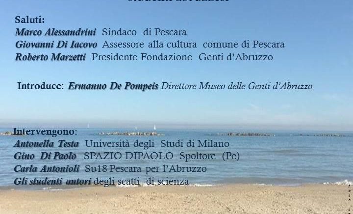 L’edizione di quest’anno rinnova l’impegno ventennale profuso dagli organizzatori per diffondere la cultura scientifica attraverso argomenti legati alla storia e all’attualità della fisica e dell’astronomia. Con lo stesso obiettivo sono stati anche promossi alcuni progetti speciali, come “Vedere la Scienza”, festival internazionale del film, del video e del documentario scientifico. “Scatti di scienza”, dal 2009, si avvale anche della collaborazione del Museo di Fotografia Contemporanea di Cinisello Balsamo. Singolarmente o in piccoli gruppi, i ragazzi coinvolti nell’iniziativa scattano “fotografie scientifiche” assecondando la propria curiosità e liberando fantasia e spirito di osservazione. Il progetto è sempre accompagnato da un’articolata attività svolta in classe. Anche quest’anno sono state diverse le opportunità a disposizione degli studenti per realizzare il proprio “scatto di scienza” Alcuni ragazzi hanno documentato un istante significativo di un esperimento, altri hanno “immaginato” e preparato la fotografia prima dello scatto; altri ancora hanno colto la bellezza di un particolare fenomeno naturale, mossi dalla sorpresa nell’osservazione di qualcosa di inaspettato; alcuni, infine, hanno pensato alla sceneggiatura per un filmato. “Scatti di scienza”, all’ottava edizione pescarese, vede da sempre la partecipazione dei lavori in loco alla selezione nazionale, durante la quale i lavori presentati dai ragazzi abruzzesi hanno sempre ricevuto importanti riconoscimenti. Il momento finale di “Scatti di scienza”, organizzato a Pescara con il Museo Genti d’Abruzzo e con il patrocinio del Comune, vedrà la presentazione delle fotografie selezionate davanti a una platea composta da studenti di vari livelli scolastici, oltre che dagli insegnanti e dal pubblico. Alla giornata prenderanno parte il presidente della Fondazione Genti d’Abruzzo, Roberto Marzetti, il sindaco di Pescara, Marco Alessandrini, l’assessore alla cultura, Giovanni Di Iacovo e Carla Antonioli (presidente Su18 Pescara per l’Abruzzo), Ermanno de Pompeis (direttore Museo delle Genti), Antonella Testa (Università degli studi di Milano), Gino Di Paolo, noto fotografo d’arte.