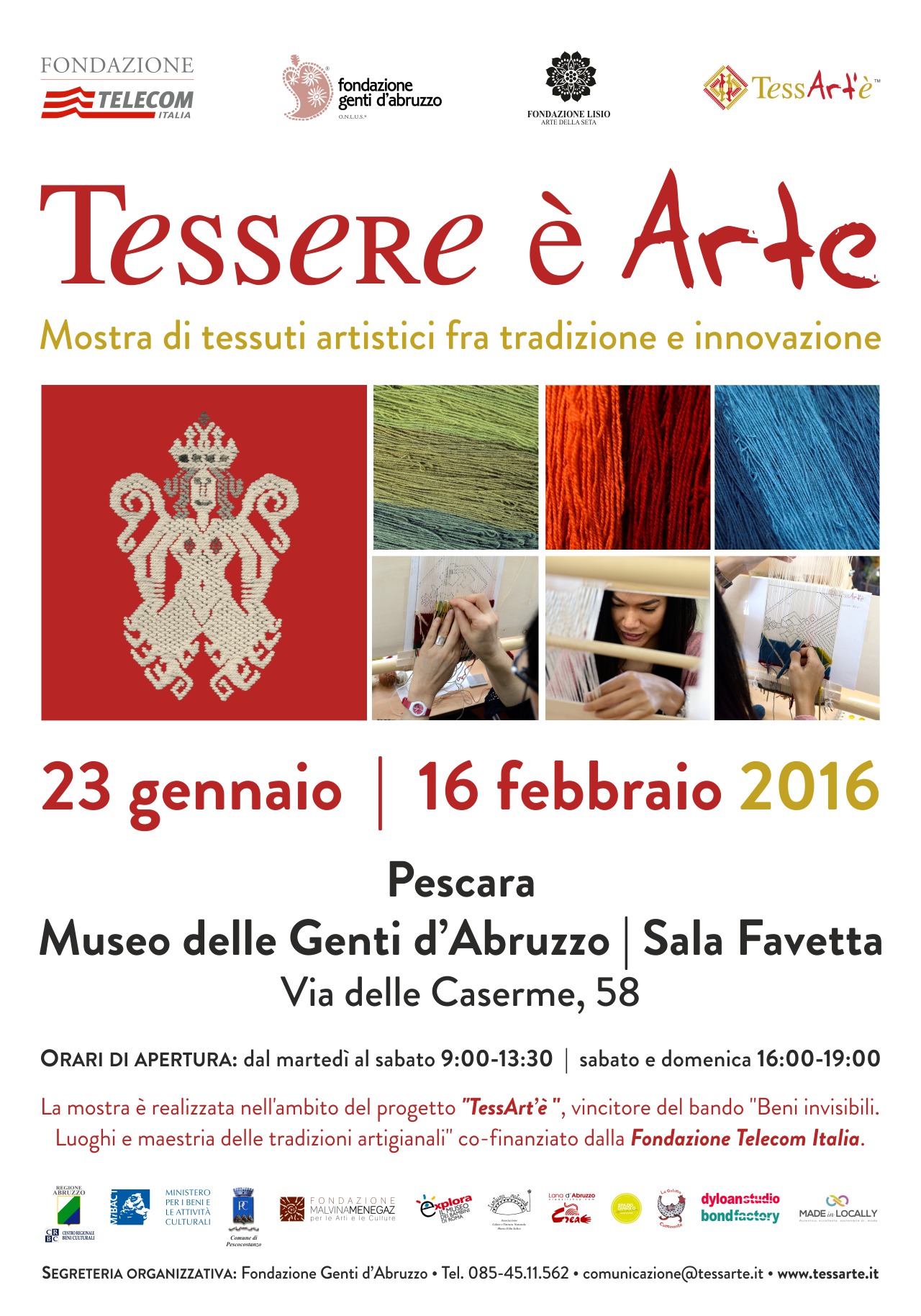 L’Abruzzo è stato celebre in passato per i suoi tessuti artistici. Oggi la loro produzione sul territorio è per lo più ferma per mancanza di conoscenze tecniche, maestranze e manifatture. Con TessArt’è, le Fondazioni Genti d’Abruzzo e Arte della Seta Lisio insieme alla Fondazione Telecom Italia intendono far riscoprire a tutti la tradizione artigianale e culturale delle produzioni tessili artistiche abruzzesi. Partendo dalla riscoperta e riappropriazione della tradizione e identità culturale abruzzese, la tessitura artistica sarà oggetto d’innovazione e studio di nuove possibilità tecniche e artistiche. Da questi presupposti nasce ‘Tessere è Arte’.Con la curatela scientifica di Erika D’Arcangelo, l’evento e i suoi contenuti artistico-artigianali sono stati anticipati alla stampa questa mattina. Alle nostre telecamere l’onore di filmare in anteprima ciò che da domani pomeriggio sarà possibile vedere e ‘toccare’: l’arte tessile di un Abruzzo lontano, ma mai del tutto smarrito. Un’arte che racconta di donne e telai, di lane anche esportate e disegni ispirati dalla natura.