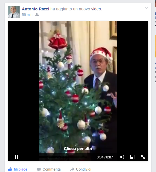 Cappello rosso in testa a mo’ di Babbo Natale, con tanto di stelline accese e intermittenti vicino alle lucine dell’Albero decorato, il senatore Antonio Razzi così vuole fare gli auguri a tutti gli Abruzzesi nel video (guarda sotto) che ha pubblicato sulla sua Pagina Facebook.