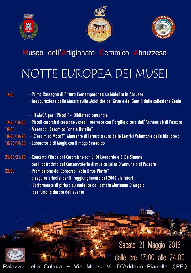 In occasione della Notte Europea dei Musei il Museo dell’Artigianato Ceramico Abruzzese (M.A.C.A.) di Pianella, nel Palazzo della Cultura in via Monsignor d’Addario, prolungherà la normale apertura di sabato 21 maggio fino a mezzanotte.