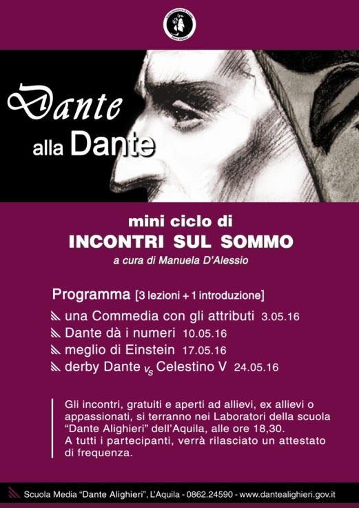 L’Aquila , ciclo d’incontri su Dante alla scuola secondaria di primo grado Dante Alighieri. “Dante alla Dante”, con questo titolo si è aperto martedì 3 maggio un mini ciclo di incontri gratuiti sul Sommo Sapiente.