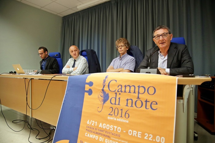 Il cartellone di Campo di note, consultabile sul sito ufficiale (Clicca Qui), è stato presentato oggi a Pescara, nella sede della Regione Abruzzo, dal Direttore artistico della rassegna, Giorgio Sasso, dal Sindaco, Giovanni Di Mascio, e dall’ideatore del festival, Paolo Faieta. Anche l’edizione 2016 presenta nove grandi appuntamenti concertistici lungo tutto il mese di agosto. Classica, jazz, musica popolare, strumentale, vocale, accostate senza immediati punti di contatto se non quelli della grande qualità interpretativa e del gusto per la contaminazione di generi.