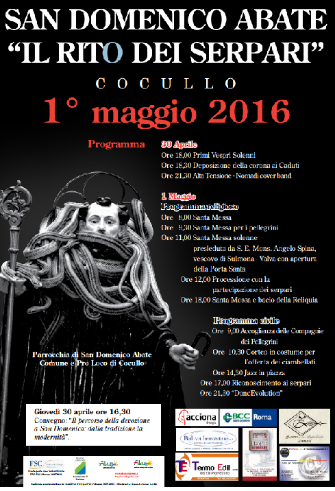 Ricco il programma della Festa di san Domenico Abate con il Rito dei Serpari 2016, organizzato da Associazione Pro Loco, Associazione Culturale Di Nola e Comune. Cocullo attende, domani, migliaia di persone che riempiranno strade e vicoli del centro storico. Quest’anno, in occasione del Giubileo della Misericordia, il vescovo di Sulmona – Valva monsignor Angelo Spina aprirà la porta santa della chiesa di Santa Maria Maggiore.