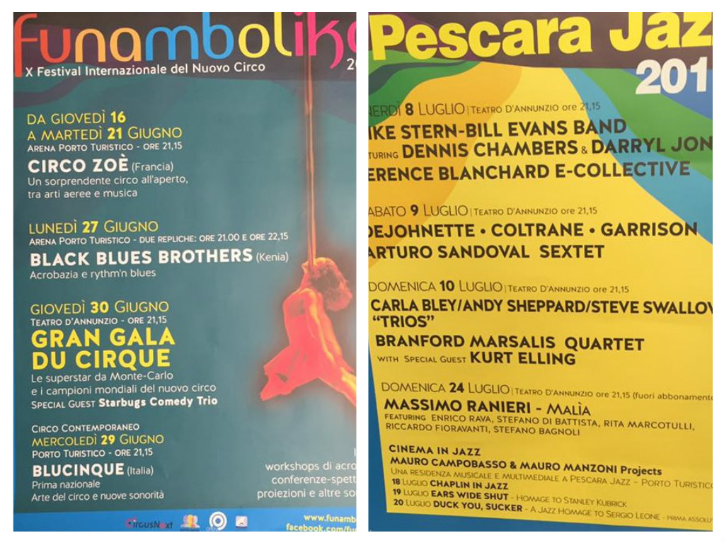 Dieci anni di Funambolika con artisti dai cinque continenti e migliaia di presenza. Anche per l’edizione 2016, ha riferito Raffaele de Ritis presidente Ente Manifestazioni Pescaresi e organizzatore dell’evento, il pezzo forte è rappresentato dagli artisti del gran Gala, tra cui quelli del Cirque du Soleil, poi spazio alle compagnie di qualità italiane e internazionali. Pescara Jazz compie 44 anni e gli eventi sono stati presentati dallo storico patron, Lucio Fumo, con nomi di prestigio del panorama internazionale e un’appendice, anch’essa interessante, dedicata a Malìa, lo spettacolo di Massimo Ranieri. Gli appuntamenti con la musica, il circo, il divertimento si svolgeranno tra il Teatro d’Annunzio e il Marina di Pescara.