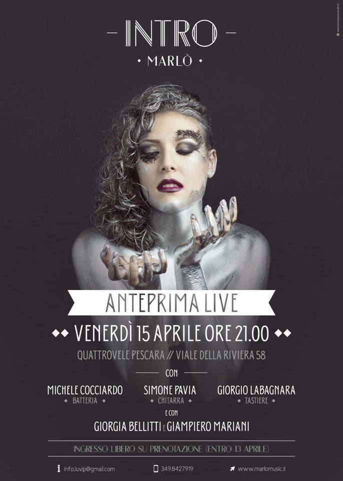 Ha deciso di giocare in casa Marlò. La cantautrice, pescarese doc, ha scelto il mare della sua Pescara per far prendere il largo al suo primo cd INTRO, in uscita il 13 maggio ed in anteprima live al QUATTROVELE di Pescara venerdì 15 Aprile ore 21:00. E come tutte le partenze per mare, ha dovuto dirigere le sue vele per sfruttare al meglio anche i venti contrari che hanno provato a soffiare forte, con un imprevisto spostamento della location. Ma oggi il mare è calmo, il sole è alto e la riviera di Pescara sembra una piccola Miami. Il posto ideale per svelare le sue sonorità, volutamente dal respiro internazionale.