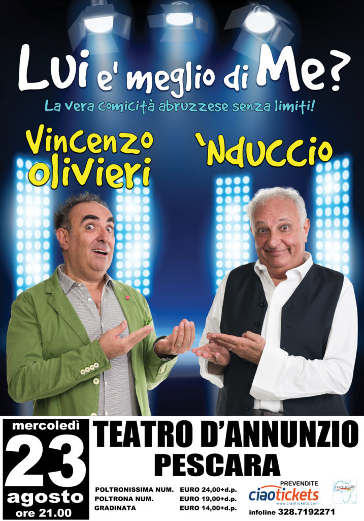 Dopo anni, tornano a esibirsi insieme Nduccio e Vincenzo Olivieri nello spettacolo “Lui è meglio di me?”, in scena domani sera, 23 agosto, al Teatro d’Annunzio di Pescara.