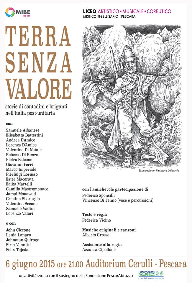 Lo spettacolo è stato realizzato in occasione della chiusura del corso stesso e dell’anno scolastico. Il debutto è previsto per questa sera, alle ore 21.00, presso l’auditorium Cerulli, in via Verrotti a Pescara. Lo spettacolo sarà preceduto da un momento molto toccante: la premiazione dei vincitori della prima edizione del concorso “Chi A.M.A. lascia il segno”, organizzato e promosso dal liceo “Bellisario” in ricordo di tre alunni scomparsi prematuramente lo scorso anno. Al concorso, che era articolato nelle sezioni: Letteratura, Musica, Arti Figurative, Fotografia , Grafica e Video, hanno partecipato gli studenti delle scuole superiori di Pescara e provincia. Lo staff organizzativo che ha permesso l’attivazione del premio è composto dai docenti: Nicoletta Castronuovo, Alessandra Febo, Ines De Rosa, Lara Bianchini, Mirella D’Andrea, Daniela Giampaolo, Roberto Battestini. “Terra senza valore” è un allestimento scenico sul tema del brigantaggio nell’Abruzzo post-unitario. Attraverso una performance articolata anche in musica dal vivo, balli e canzoni, gli studenti del Laboratorio di Arti Sceniche fanno rivivere le figure storiche di alcuni dei briganti più noti, da Luca Pastore a Carmine Crocco, da Sandro Scenna a Ninco Nanco. Le loro storie sono proiettate sullo sfondo di un sud contadino, nel quale inizia a delinearsi in maniera già chiara ed eloquente la Questione Meridionale. 23 giovanissimi attori (il più giovane ha 15 anni, il più grande ne ha 19), danzatrici, musicisti cantini solisti e coriste danno vita a uno spettacolo, del quale la professoressa Federica Vicino ha curato la stesura del testo e la regia.