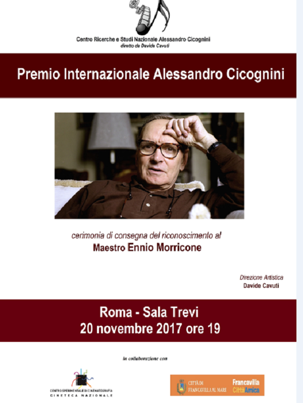 Questa sera, alle ore 19 nella “Sala Trevi” di Roma, il Maestro Ennio Morricone riceverà il “Premio Internazionale Cicognini”. La manifestazione, organizzata dal Cresnac (Centro Ricerche e Studi Nazionale Alessandro Cicognini) diretto dal compositore Davide Cavuti, è in collaborazione con il “Centro Sperimentale di Cinematografia” di Roma, la “Cineteca Nazionale” e il comune di Francavilla al Mare.