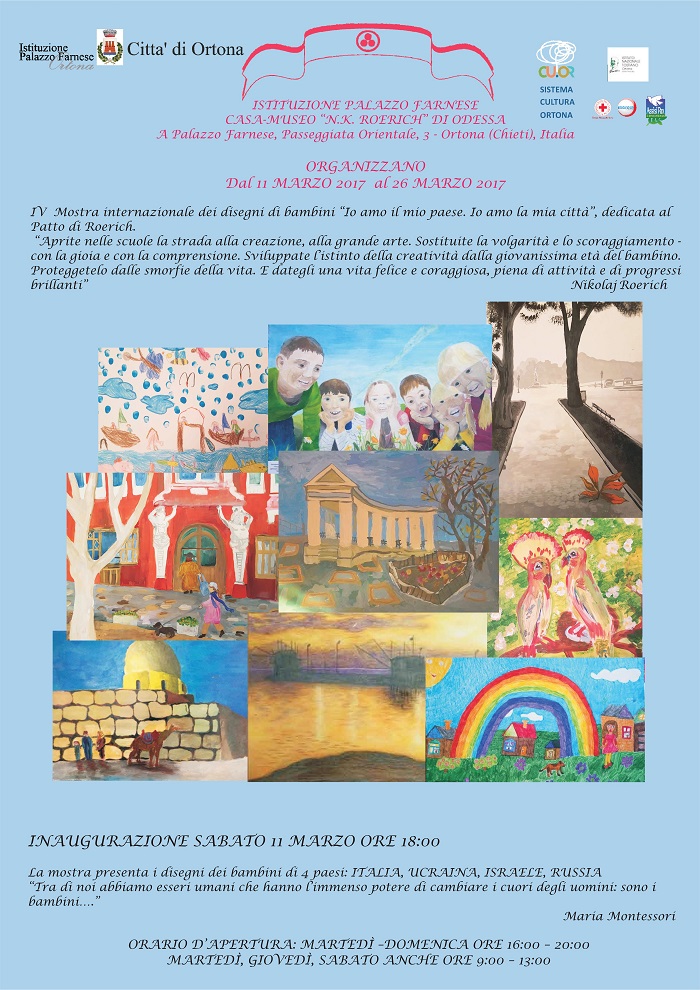 L’Istituzione Palazzo Farnese di Ortona e La Casa-Museo “N.K. Roerich” di Odessa (Ucraina) organizzano la IV Mostra Internazionale dei disegni dei bambini: “ Io amo il mio paese. Io amo la mia città.” con la partecipazione di quattro Nazioni (Italia, Russia, Israele, Ucraina). L’evento è stato già organizzato ad Odessa nell’autunno 2016 e dedicato al Patto Di “N.K. Roerich. La Casa-Museo “N.K. Roerich” di Odessa (Ucraina), fondata nell’2000, funziona come Centro Culturale e mette a disposizione del pubblico il patrimonio creativo della famiglia Roerich (le idee del Patto di Roerich e la Bandiera della Pace). N.K.Roerich (1874-1947) fu pittore, scrittore, poeta, filosofo, giurista ed archeologo di fama mondiale. Il Patto di Roerich (Patto di Washington) fu firmato il 15 aprile 1935, ed è conosciuto anche come L’Accordo su protezione di Enti dell’Arte e della Scienza e di Monumenti storici . E’ stato inoltre il primo accordo internazionale nella storia mondiale sulla protezione del retaggio culturale. Alla base del Patto e con lo scopo di sviluppare le idee del Patto sono state firmate tante Convenzioni Internazionali ONU – UNESCO. La mostra che si terrà ad Ortona ha raccolto circa 500 disegni:150 disegni selezionati sono arrivati in Italia e saranno esposti dal’11 al 26 marzo dell’anno corrente presso l’ Istituzione Palazzo Farnese. L’inaugurazione avverrà l’11 marzo alle ore 18. Nel corso della manifestazione saranno eseguiti brani musicali dalla pianista Ucraina Elena Tomych di F.P. Tosti , Y.Stepovy, Ciajkovskij, J William specifici di ogni paese partecipante . Ancora una volta una mostra Internazionale a Palazzo Farnese di Ortona sotto il patrocinio della: Croce Rossa Italiana, Asissi Pax International e Maram’s Fondation.
