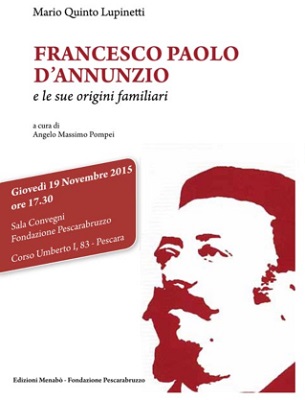 Francesco Paolo D’Annunzio e le sue origini familiari è il titolo del volume di Mario Quinto Lupinetti a cura di Massimo Pompei. Il volume sarà presentato giovedì prossimo 19 novembre alle ore 17,30 presso la sala Convegni della Fondazione Pescarabruzzo in Corso Umberto a Pescara.