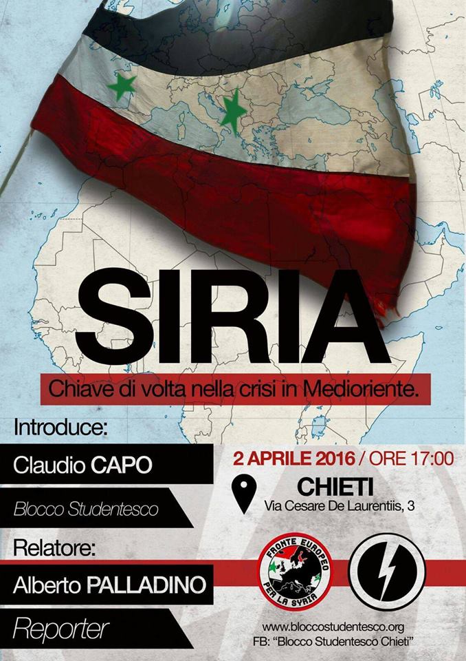 Il Blocco Studentesco Chieti organizza una conferenza, nella sede di via Cesare De Laurentiis, alle 17.00, per chiarire, in un momento storico come questo, l’importanza della questione siriana, “ultimo baluardo d’esempio di Nazione sovrana – affermano gli organizzatori – ed ultimo esempio della lotta al terrorismo.” Interverranno Claudio Capo (militante del Blocco Studentesco Chieti) ed Alberto Palladino (reporter e volontario Sol.Id.) che spiegherà, dopo svariate missioni in Siria ed in Medioriente, la questione Siriana.