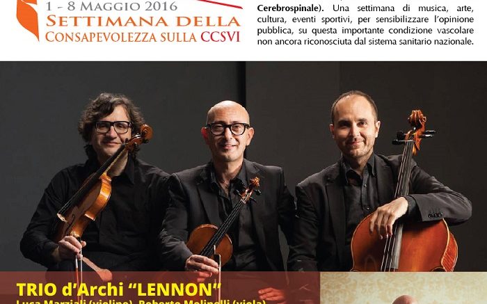 L’appuntamento con la musica e la solidarietà è per il prossimo 2 maggio, alle 21.30, all’Auditorium del Conservatorio L. d’Annunzio di Pescara dove si esibirà il Trio d’Archi Lennon, composto da Luca Marziali (violino), Roberto Molinelli (viola), Alessandro Culiani (violancello), con la partecipazione del M° Massimo Magri (violoncello). Il concerto rientra nell’ambito della Settimana della Consapevolezza sulla Insufficienza Venosa Cronico Cerebrospinale, a cura dell’Associazione CCSVI Onlus, che si svolgerà dal 1° all’8 maggio. Sarà una sette giorni all’insegna di musica, arte, sport, per sensibilizzare l’opinione pubblica su questa importante condizione vascolare non ancora riconosciuta dal Sistema Sanitario nazionale.