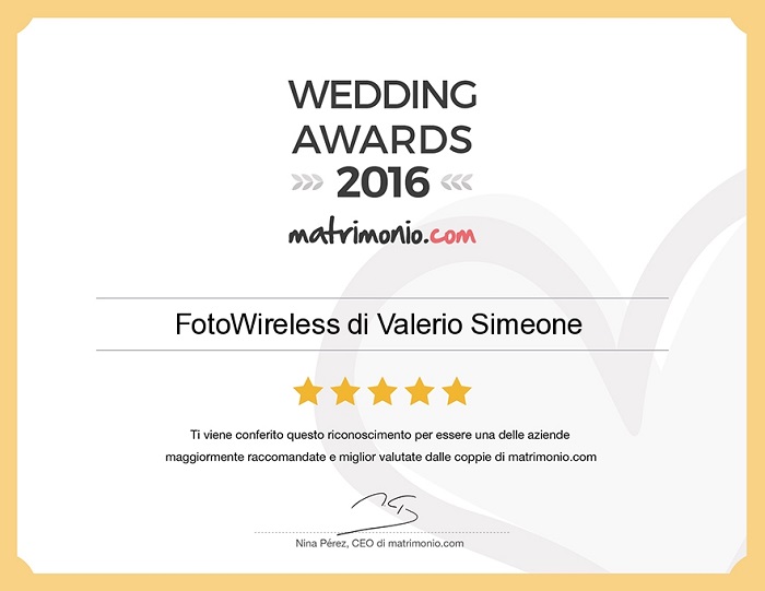 Ancora un premio entra nella redazione della FotoWireless, di Valerio Simeone, nella categoria “Fotografia e video di matrimonio”: è il Wedding Awards 2016, realizzato dal sito matrimonio.com e vinto per il secondo anno consecutivo. Tra i 41 mila fornitori di servizi attinenti alle nozze che hanno partecipato, Matrimonio.com ha conferito un nuovo prestigioso riconoscimento alla FotoWireless, quale migliori fotografi di matrimonio in Abruzzo per lo stile fotogiornalistico e video cinematografico. Il premio è stato assegnato in base alle recensioni ricevute durante questi anni analizzando giudizi e continuità della soddisfazione degli stessi clienti.