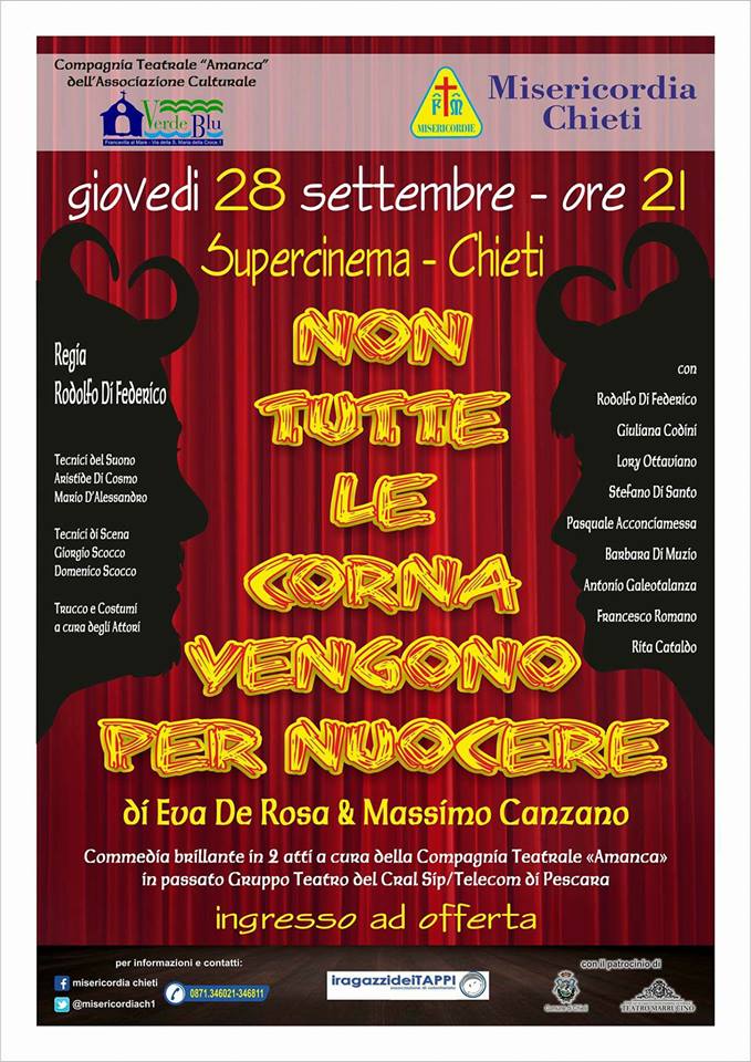 “Non tutte le corna vengono per nuocere”di Eva De Rosa e Massimo Canzano, il titolo della commedia dialettale della Compagnia teatrale Amaca dell’associazione culturale VerdeBlu di Francavilla. L’obiettivo è di raccogliere dei fondi da destinare all’acquisto di un mezzo di soccorso. Particolarità della serata del 28 settembre al Supercinema di Chieti è che non ci sarà un biglietto da acquistare ma “il lascito di un offerta all’ingresso.”