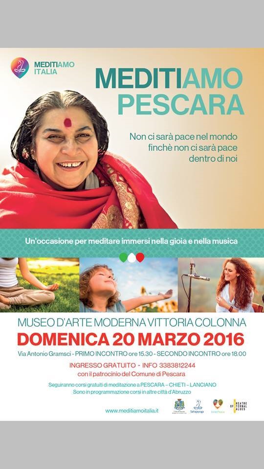 “Meditiamo Pescara”, appuntamento al museo Colonna, domenica prossima, 20 marzo, per conoscere da vicino Sahaja Yoga, secondo gli insegnamenti di Shri Mataji Nirmala Devi.