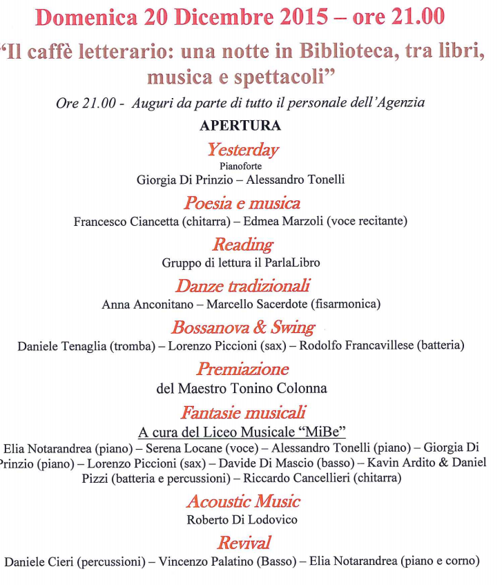 Biblioteca in festa domenica 20 dicembre dalle 21.00 in poi, alla Di Giampaolo di Pescara, tra musica, danza e poesia.