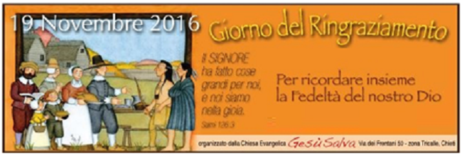 Dopo un primo inverno durissimo, i Padri Pellegrini impararono a valorizzare quel territorio a loro sconosciuto dai nativi del luogo: iniziarono a coltivare colture mai viste prima in Europa, come mais, orzo, fagioli e zucche, con ottimi risultati. Il raccolto dell’autunno successivo fu molto ricco e i coloni a fronte di questo primo buon raccolto nel nuovo continente, decisero di organizzare una festa e riunirsi per ringraziare il Signore per quanto aveva provveduto. Nei secoli successivi la tradizione del ThanksgivingDay si estese a tutto il paese. Sarà George Washington nel 1789 a dichiarare ufficiale la Festa del Ringraziamento per tutti gli stati membri, ma solo nel 1863 con Abramo Lincoln il “Giorno del Ringraziamento” diventa una vera e propria festa comandata,collocando tale festività sul calendario. Questa storia ci parla di aiuto reciproco, condivisione, integrazione ma soprattutto di RINGRAZIAMENTO.Un ringraziamento fatto ad un Dio amorevole che provvede anche quando ci troviamo nelle peggiori difficoltà. Per noi della Chiesa Evangelica Pentecostale di “Gesù Salva” è tutto cominciato nel 2013 quando, alcune famiglie di origine americana, hanno cominciato a raccontarci di questa festività, per loro tanto importante pur non vivendo più negli USA. Così abbiamo pensato sin da subito di riproporre questoevento alla collettività. Lo so, non siamo americani, ma la festa la riproponiamo non tanto per Abramo Lincoln, George Washington o per i Padri Pellegrini, ma proprio per lo spirito che ritroviamo all’origine di questa festa: il desiderio di ringraziare Dio per tutta la sua benevolenza nei nostri confronti.