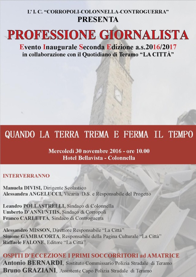 L’iniziativa è stata organizzata dall’Istituto Comprensivo di “Corropoli-Colonnella-Controguerra” e rientra nell’ambito della Seconda Edizione del progetto “Professione Giornalista”, curato dalla prof.ssa Alessandra Angelucci, nato in collaborazione con il quotidiano di Teramo La Città. L’appuntamento si terrà mercoledì 30 novembre alle ore 10.00, nelle sale dell’Hotel Bellavista di Colonnella e affronterà come tema principale quello ancora vivo dell’emergenza terremoto. “Quando la terra trema e ferma il tempo” è, infatti, il titolo scelto che porterà tutti gli alunni a riflettere sul tema insieme ai giornalisti, ai docenti, e a due ospiti d’eccezione che per primi – come ha testimoniato la stampa negli scorsi mesi – hanno portato soccorsi ad Amatrice, luogo ferito pesantemente dal sisma del 24 agosto 2016: Antonio Bernardi e Bruno Graziani, rispettivamente il Sostituto Commissario e l’Assistente Capo della Polizia Stradale di Teramo. Insieme a loro interverranno: Umberto D’Annnuntiis, Sindaco di Corropoli, Leandro Pollastrelli, Sindaco di Colonnella, Franco Carletta, Sindaco di Controguerra; per la Redazione de La Città:Alessandro Misson, Direttore Responsabile, Simone Gambacorta, Responsabile della Pagina Culturale, Raffaele Falone, Editore; per l’Istituto Comprensivo: la Dirigente Scolastica Manuela Divisi e la Vicepreside Alessandra Angelucci.