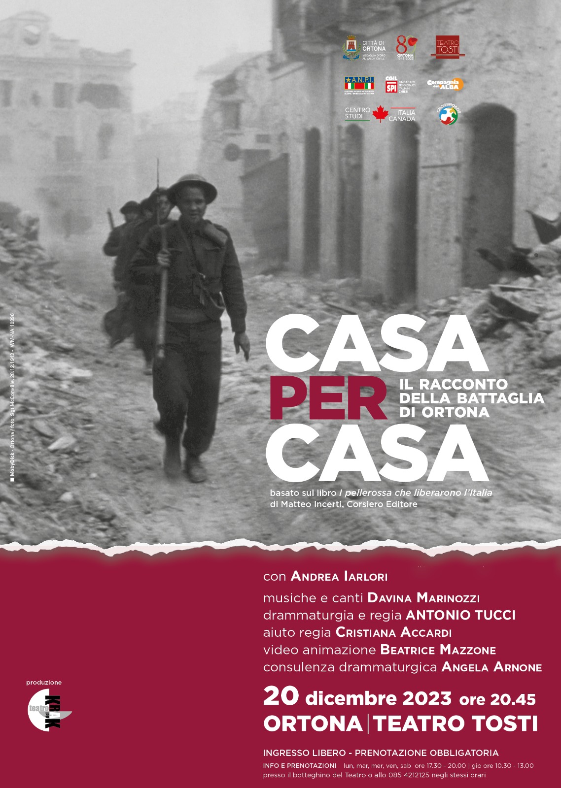 Secondo appuntamento teatrale con la Storia che, nel 1943, entrò tragicamente e violentemente nelle case degli ortonesi aprendo ferite che, a 80 anni di distanza, sono ancora vive nella memoria di una popolazione uscita stremata dalla Battaglia della Seconda Guerra Mondiale durante la quale si affrontarono, strada per strada, Alleati e Tedeschi e che valse alla città la Medaglia d’oro al Valor civile. Sul palcoscenico del teatro “Francesco Paolo Tosti” andrà in scena, mercoledì 20 dicembre alle 20:45, “Casa per Casa: il racconto della Battaglia di Ortona” del Teatro del Krak basato sul libro “I pellerossa che liberarono l’Italia” di Matteo Incerti (Corsiero editore). Il Comune di Ortona, la sezione “Dario Serafini” dell’ANPI di Ortona, lo SPI-CGIL celebreranno i drammatici fatti dell’autunno-inverno 1943 trasportando il pubblico proprio in quei giorni attraverso il racconto personale di due soldati canadesi, nativi nordamericani: Gordon Yellow Fly del popolo Siksika, Blackfoot, sepolto nel cimitero canadese di San Donato, e George Campion, che, tra gli atti di valore, compì anche quello di salvare un neonato dalle braccia della madre morta rischiando la propria vita. Nell’autunno del 1943 la storia con la S maiuscola incontrò le storie personali degli abitanti della città e di coloro che vennero ad affrontarsi per le strade di Ortona. Fu un incontro fatale, che portò morte e distruzione di cui Ortona porta ancora oggi i segni.