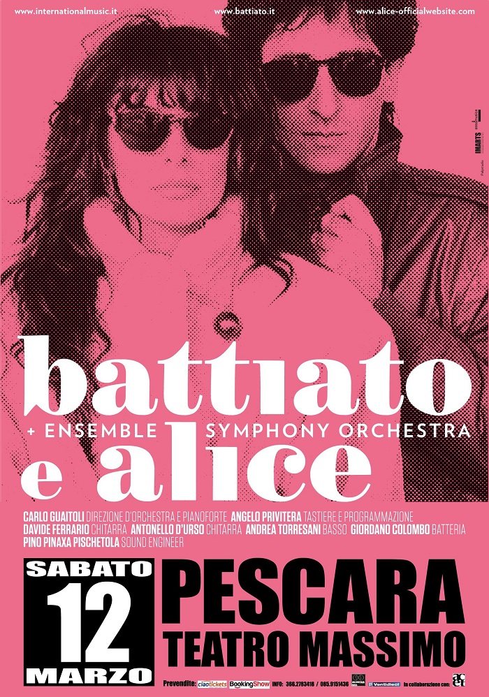 Biglietti esauriti da più di un mese per l’unica data in Abruzzo dei grandi due artisti con il “Battiato e Alice Tour” prevista al Teatro Massimo di Pescara per l’unica data in Abruzzo, sabato 12 marzo.
