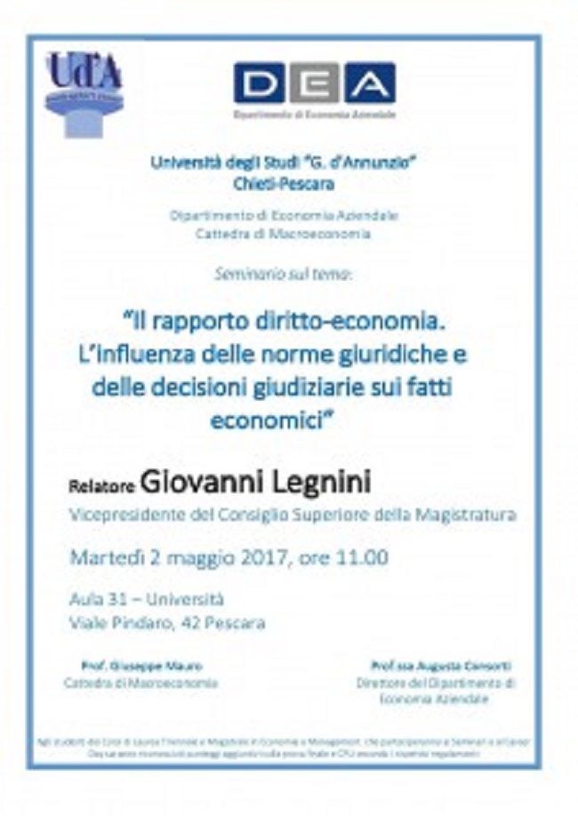 “Il rapporto diritto-economia. L’influenza delle norme giuridiche e delle decisioni giudiziarie sui fatti economici”, il titolo del seminario che si è svolto al Dipartimento di economia Aziendale dell’Università d’Annunzio di Pescara.