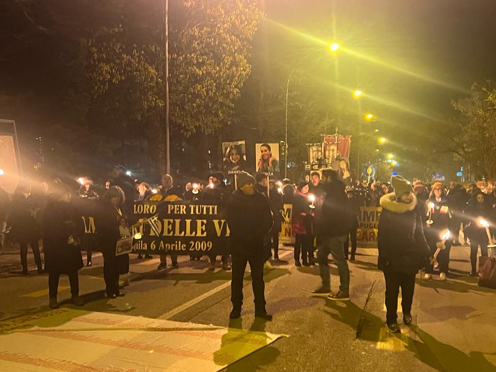 La fiaccolata – “Fare memoria è l’unica cosa che ci rimane”. Gli occhi e la voce flebile tradiscono un dolore che dopo 14 anni è sempre lo stesso: nulla è cambiato da quella notte in cui Alessandra Bortoletti provò invano a chiamare sua sorella Daniela, all’epoca 21enne, dopo la scossa delle 3.32. Stasera Daniela, originaria di Torre dei Passeri (Pescara) è ricordata tra le 309 vittime del sisma e la sua foto compare ora in uno dei grandi cartelli che sfilano, anno dopo anno, nella fiaccolata della memoria. “Ci ritroviamo qui e per me è come se fosse la prima volta – dice Alessandra – avremmo voluto raccontare una storia diversa, mi sarebbe piaciuto dirvi altre cose, tipo giustizia è stata fatta ma non è così”. L’esigenza di fare memoria e chiedere giustizia continua a spingere persone ad aggregarsi alla fiaccolata lungo via XX Settembre, anche se la partecipazione è un po’ scesa rispetto agli anni precedenti alla pandemia. Ad accendere il braciere simbolo, posto nel Parco della Memoria di piazzale Paoli, sono state chiamate Cansu Sonmez, ricercatrice turca, dottoranda al Gran Sasso Science Institute dell’Aquila e Rasha Youssef, siriana, ingegnere chimico industriale, che lavora da diversi anni nel capoluogo, con collaborazioni anche in ateneo.
