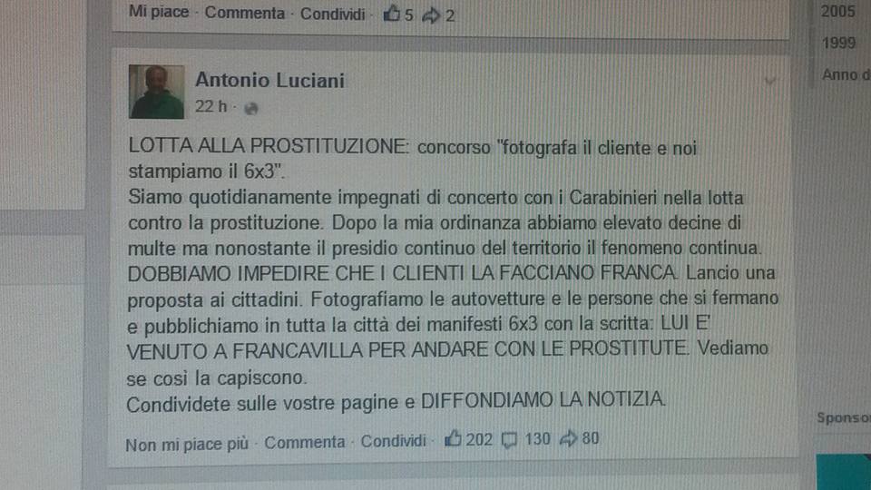 “Lotta alla prostituzione: concorso fotografa il cliente e noi stampiamo il 6×3. Siamo quotidianamente impegnati di concerto con i Carabinieri nella lotta contro la prostituzione. Dopo la mia ordinanza abbiamo elevato decine di multe ma nonostante il presidio continuo del territorio il fenomeno continua. DOBBIAMO IMPEDIRE CHE I CLIENTI LA FACCIANO FRANCA. Lancio una proposta ai cittadini. Fotografiamo le autovetture e le persone che si fermano e pubblichiamo in tutta la città dei manifesti 6×3 con la scritta: LUI E’ VENUTO A FRANCAVILLA PER ANDARE CON LE PROSTITUTE. Vediamo se così la capiscono.”
