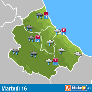 La prima parte della giornata sarà caratterizzata dalla presenza di nuvole un pò ovunque con possibilità di piogge, deboli lungo la costa, più forti nelle zone interne. La situazione andrà in graduale attenuazione durante la seconda parte della giornata. Le temperature saranno sostanzialmente stabili su tutto l’Abruzzo con le minime in forte diminuzione soprattutto nelle zone montane. Venti deboli in diminuzione nel corso della giornata. Mari fino a mossi o molto mossi in serata. La situazione nel dettaglio prevede nell’aquilano cieli molto nuvolosi al mattino con deboli piogge, in temporaneo assorbimento nel pomeriggio. In serata potrebbero verificarsi nuove deboli piogge. A Pescara il cielo sarà molto nuvoloso nella prima parte della giornata tendente a coperto con deboli piogge fino a sera. Nel teramano cielo molto nuvoloso con piogge piuttosto insistenti nella prima parte della giornata. A Chieti infine, il cielo sarà coperto con deboli piogge distribuite nell’arco di tutta la giornata.