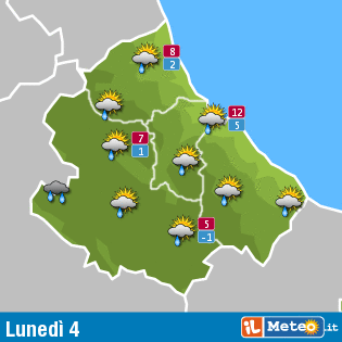 Nel teramano solo brevi isolate precipitazioni, con prevalenza di cielo coperto o poco nuvoloso. I venti saranno moderati e spireranno da sud-ovest, la temperatura sarà piuttosto bassa nelle ore notturne, intorno ai 2°, con la massima diurna sugli 8°.