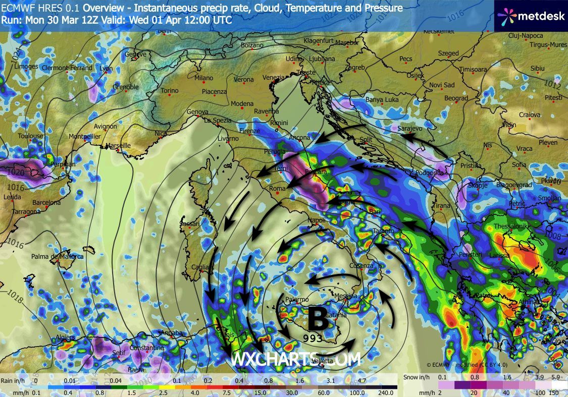 SITUAZIONE. L’Italia è interessata da un’intensa ondata di maltempo provocata dalla discesa di un nucleo di aria fredda proveniente dall’Europa centrale. Ha già raggiunto i mari occidentali e, nelle prossime ore, favorirà la formazione e l’approfondimento di un minimo depressionario in lento spostamento dal Tirreno meridionale verso il settore ionico. Di conseguenza assisteremo ad un deciso rinforzo dei venti di Grecale e a una progressiva intensificazione delle precipitazioni su gran parte delle regioni centro-meridionali, soprattutto sul versante adriatico.
