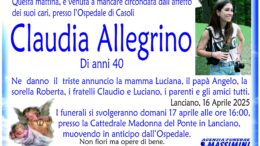 È deceduta oggi all’ospedale di Casoli (Ch) Claudia Allegrino, figlia di Angelo, ex imprenditore, presidente di Ascom Abruzzo La vita della giovane donna è stata…
