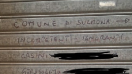 Scritte ingiuriose contro il sindaco dimissionario di Sulmona, Annamaria Casini, il consigliere regionale Andrea Gerosolimo e l’ex presidente della Regione Abruzzo, senatore Luciano D’Alfonso, sono apparse oggi sulla saracinesca di un negozio a Sulmona, a pochi passi dal Municipio.