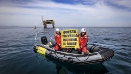 Attivisti di Greenpeace hanno aperto due grandi striscioni, sui quali si legge “STOP TRIVELLE – IERI, OGGI, SEMPRE”, nei pressi della piattaforma Fratello Cluster, posizionata poco a nord di Pescara, entro le 12 miglia marine dalla costa.
