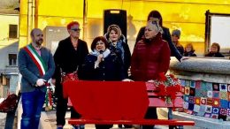 Tante persone in piazza Umberto I°, nel cuore di Corfinio, per “la panchina rossa 1522”, la campagna delle democratiche della provincia dell’Aquila contro le violenze…