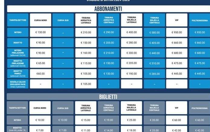 - La campagna abbonamenti inizierà martedì 16 luglio con una fase di prelazione, riservata in esclusiva ai possessori dell’abbonamento nella scorsa stagione 23/24. Sarà possibile esercitare tale prelazione sottoscrivendo l’abbonamento per il prossimo campionato Serie C Now, Girone B, da martedì 16 luglio e fino a martedì 30 luglio 2024, presso il nuovo THE OFFICIAL PESCARA STORE (orario del punto vendita, dal martedì alla domenica, 10-13 e 16,30-20,30), online sul sito ciaotickets.com e presso tutti i punti vendita d’Abruzzo affiliati a Ciao Tickets (link qui per consultarli https://www.ciaotickets.com/it/punti-vendita/elencotestuale).