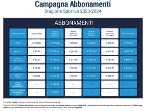Confermate tutte le categorie denominate Ridotto, sia per gli abbonamenti che per i biglietti. Tale scontistica, ricordiamo, è riservata agli over60, under18, donne e tutti i diversamente abili iscritti ai seguenti enti convenzionati: ENS, UNMS, ANIMC, ANMIL, ANMIG”.